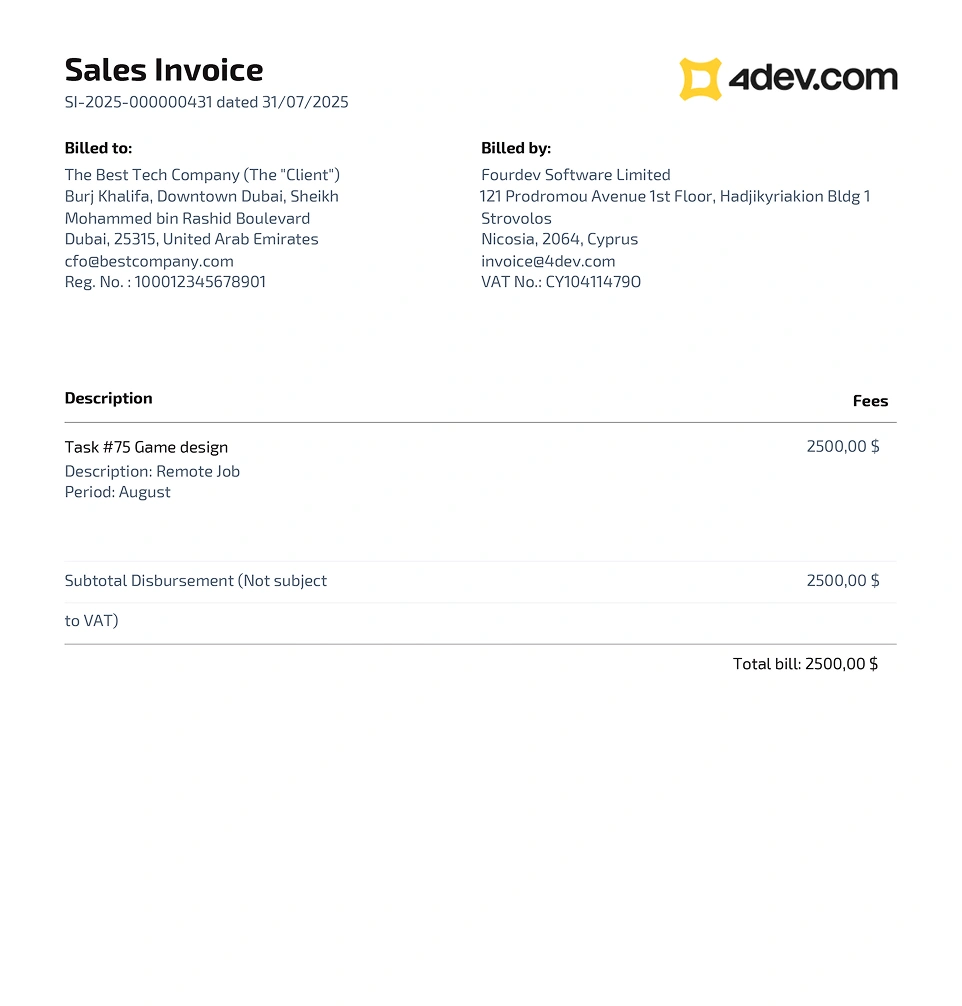 Our global team faced challenges with contractor payouts due to manual documentation and payment delays. Now, with 4dev.com, we can quickly pay in multiple currencies, receiving instant invoices.