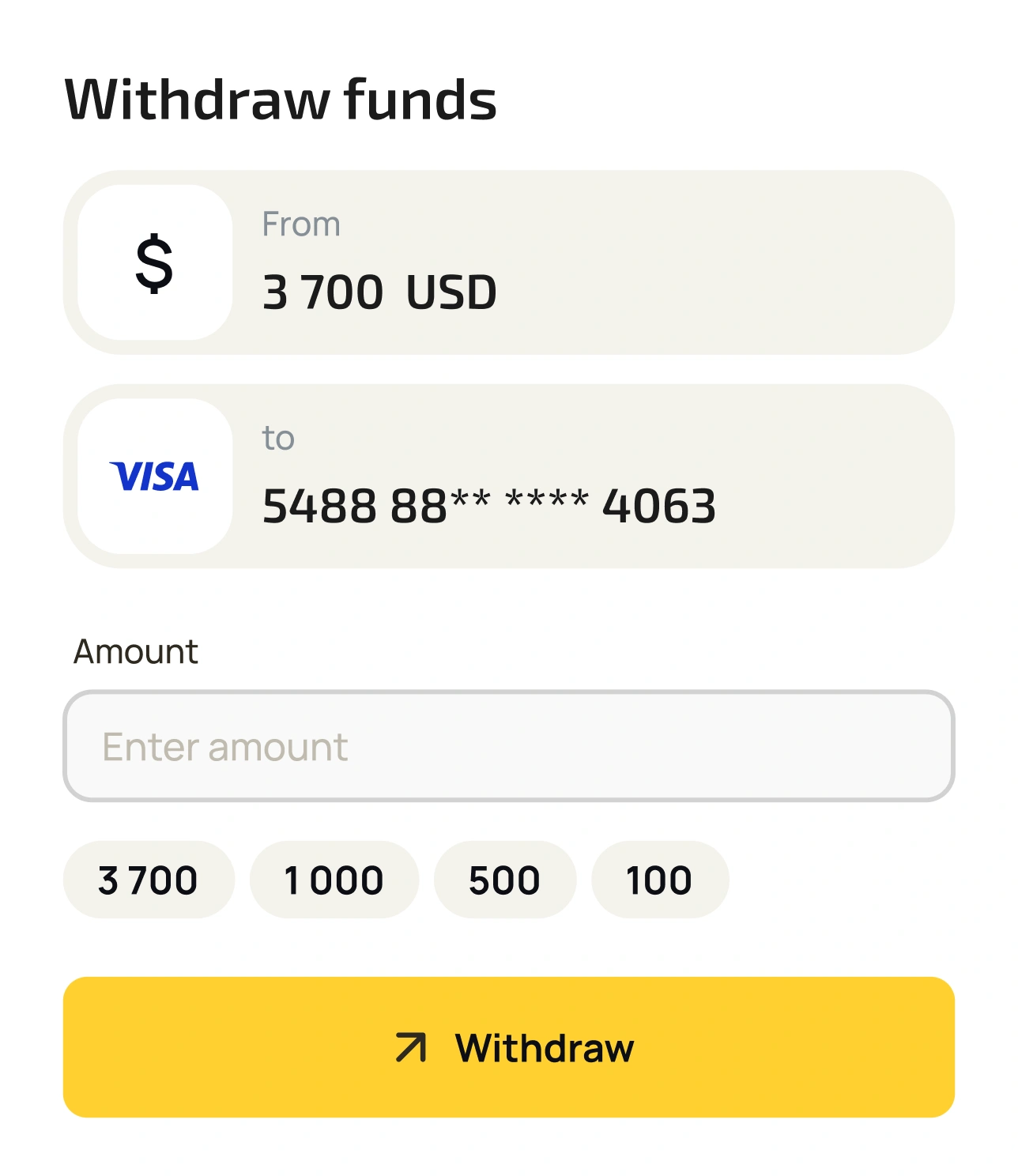 Once funds are sent to the contractor’s 4dev.com account, they can withdraw to a bank account, card, or USDT wallet. Withdrawals are typically processed within 1 business day.