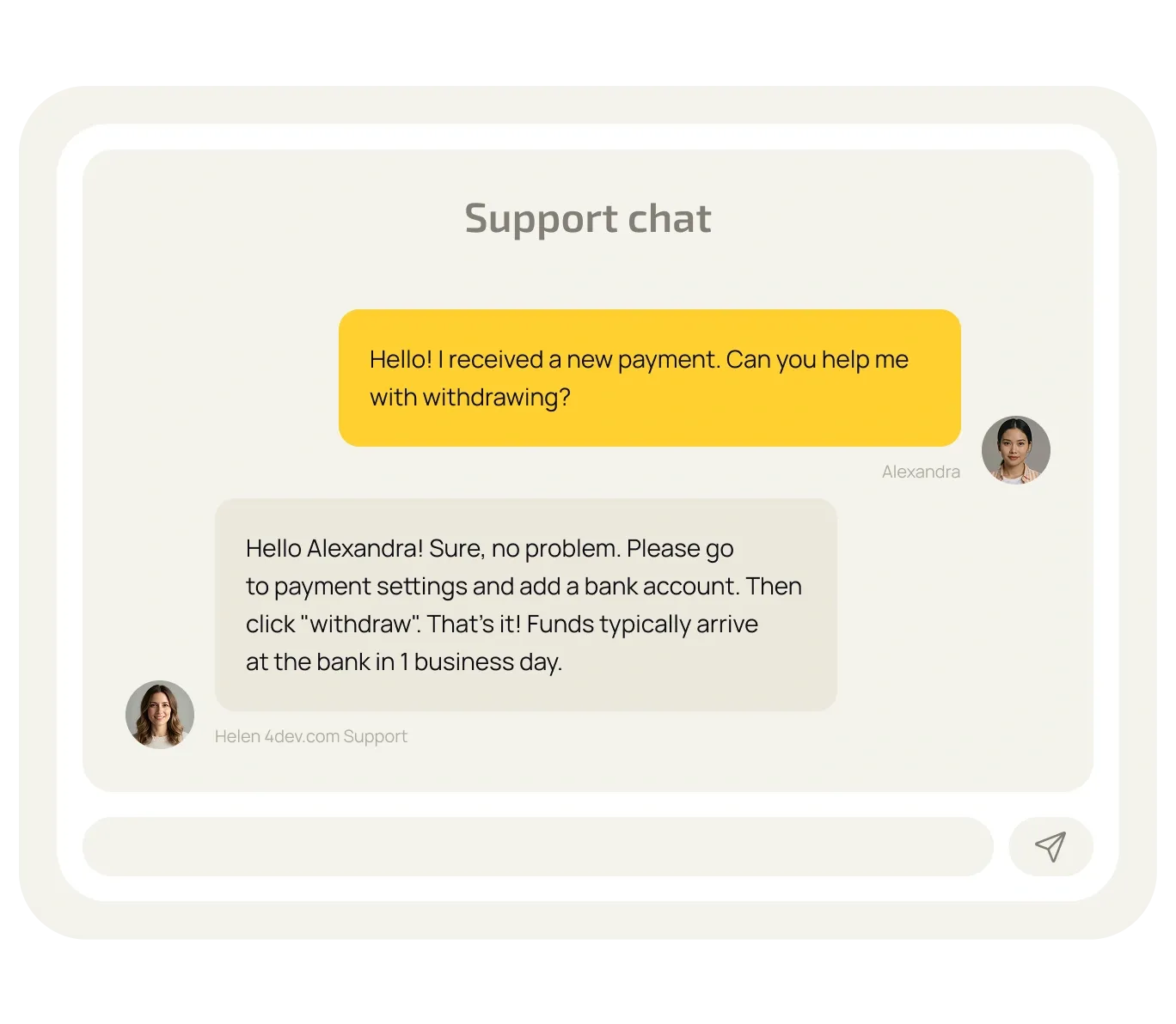 Receive payments in USDT. Withdraw your earnings to a crypto wallet or directly to your bank account or card with 4dev.com’s conversion.
