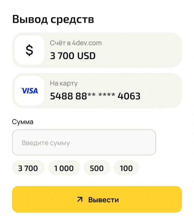 Исполнитель получает средства на счёт в 4dev.com и может вывести их на карту, банковский счёт или криптокошелёк. Вывод средств обычно занимает 1 рабочий день.