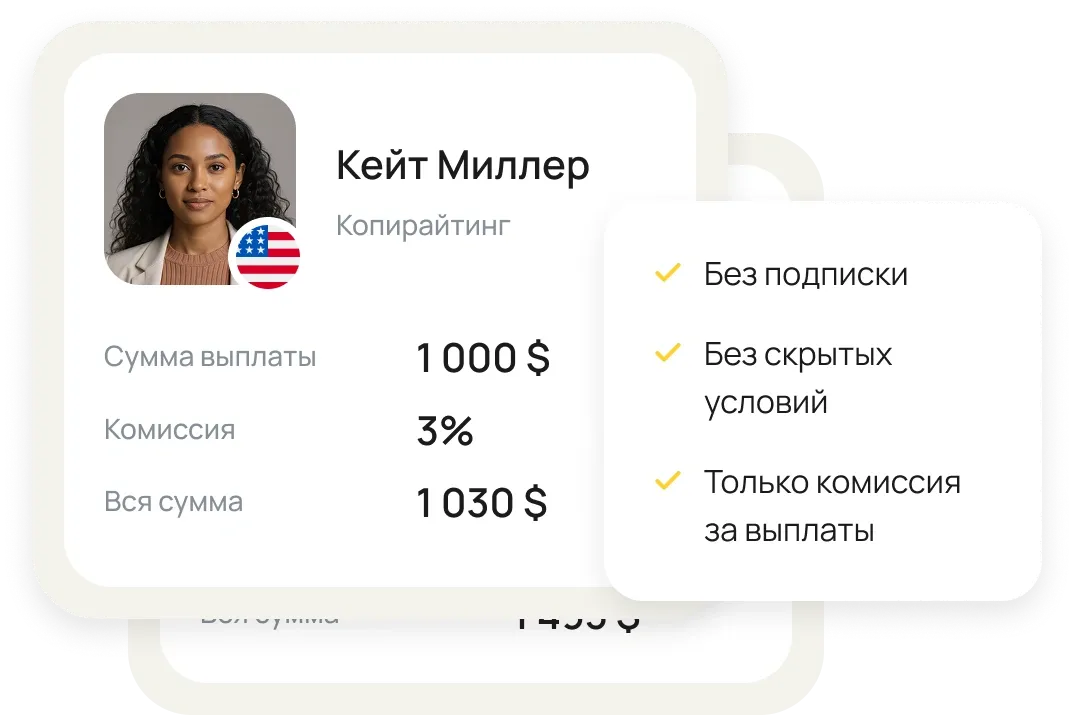 Вы можете пополнить счёт в USD, EUR или 30+ других валютах. Исполнители сами выбирают способ вывода — в фиате или криптовалюте.