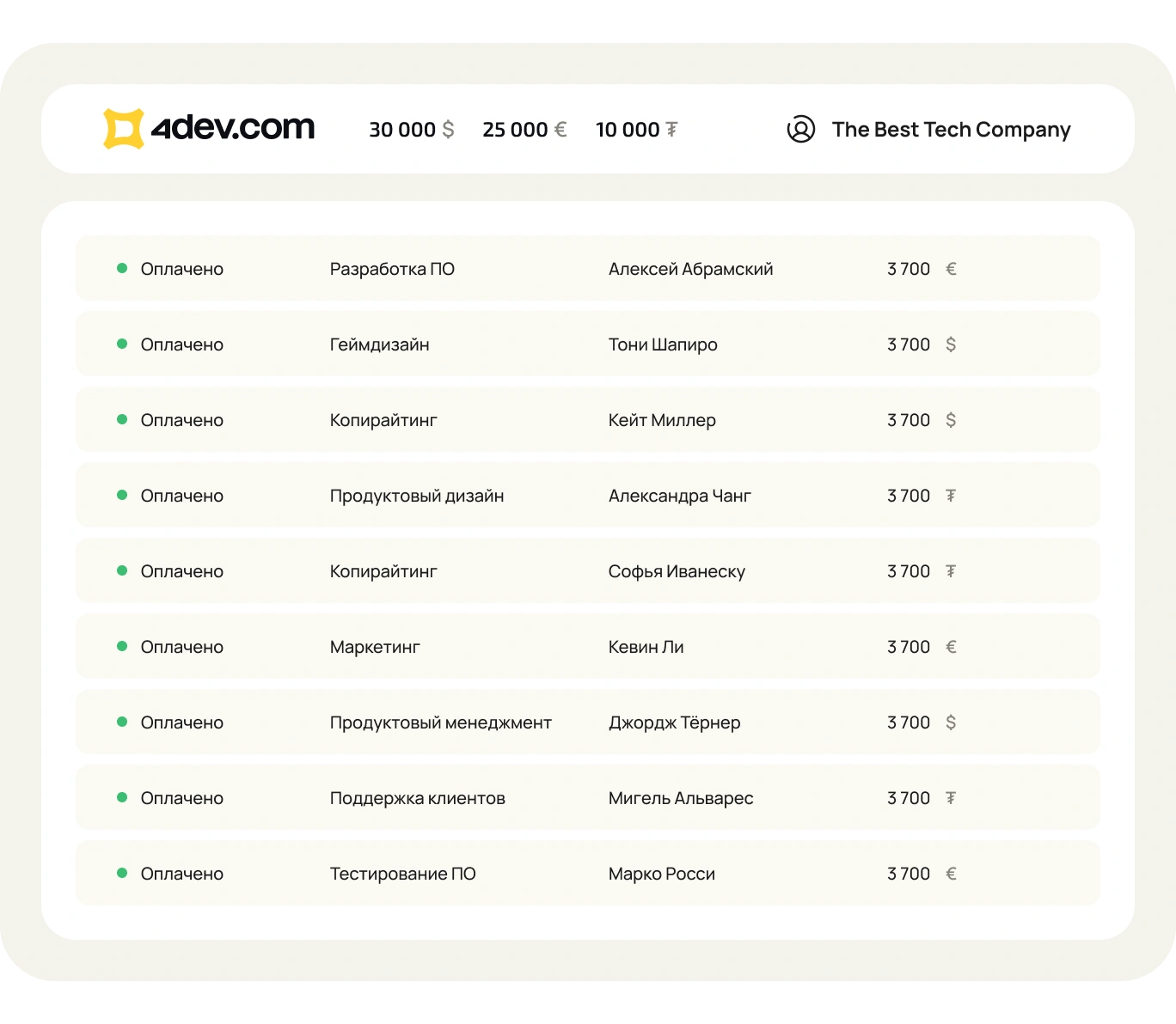 Платите команде в 150+ стран — в криптовалюте или фиате. 4dev.com автоматически генерирует инвойсы и предоставляет ежедневную поддержку клиентов.