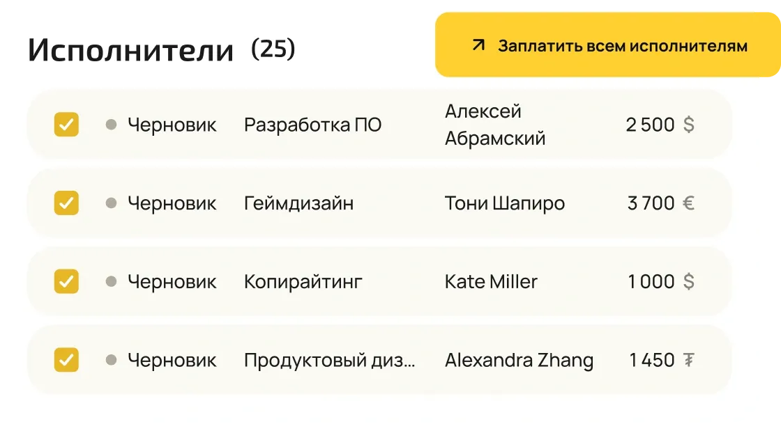 Наша международная команда сталкивалась с трудностями из-за ручных документов и задержек платежей исполнителям. С 4dev.com мы быстро платим в разных валютах и моментально получаем инвойсы.