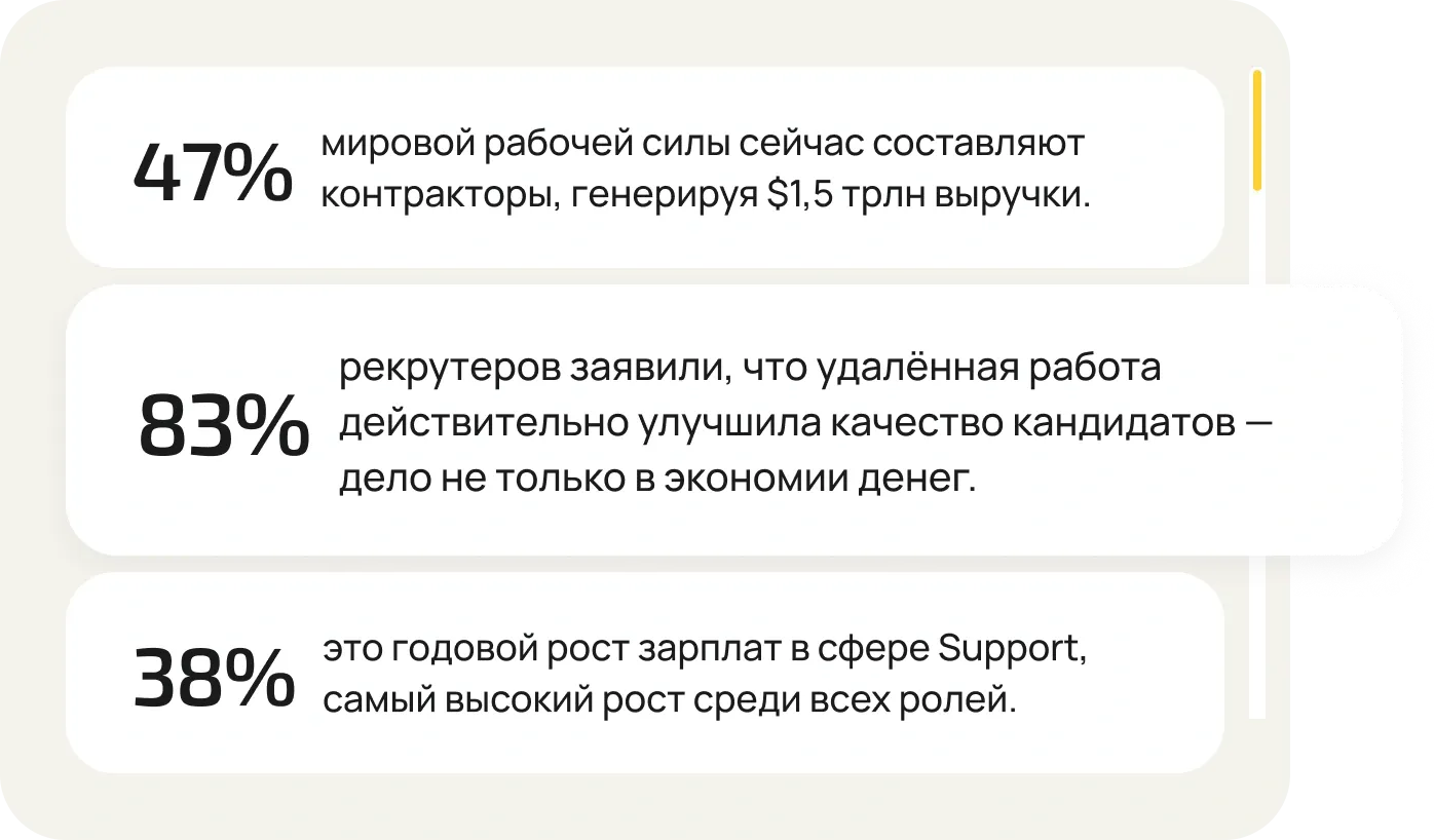 Если вы развиваете удалённую команду, управляете международной компанией или нанимаете фрилансеров на проекты, в Global Contractors Market Report вы найдёте полезные инсайты для принятия взвешенных решений.