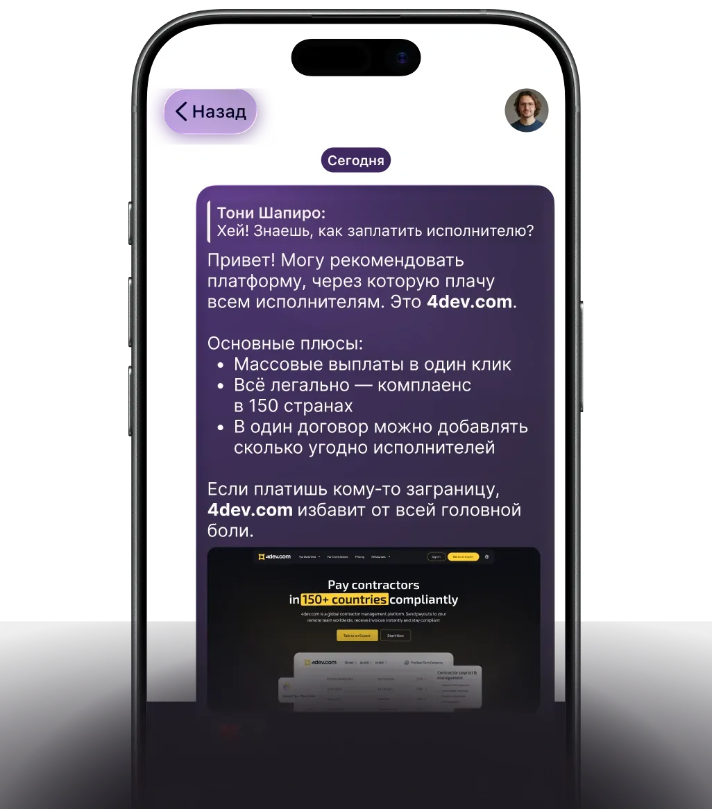 4dev.com — платформа Contractor-of-Record: компании могут платить в 150+ стран мгновенно и в полном соответствии с законом.